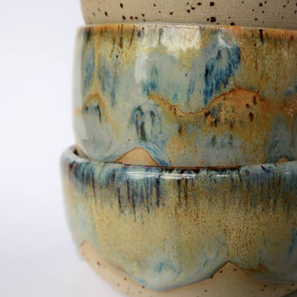durch die natürliche Reaktion im Ofen, etsteht bei jedem Stück ein Einzigartiges Muster. Keine Glasur gleicht der anderen, so das jedes Gefäß unverwechselbares Unikta bleibt.
